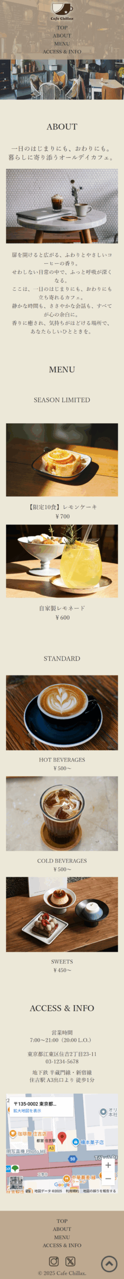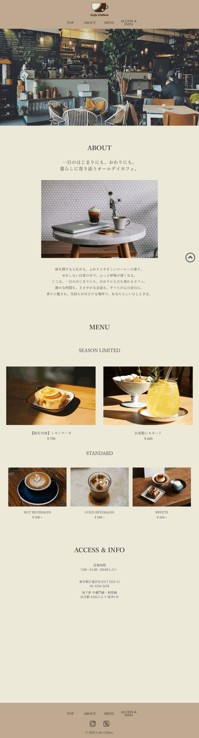 - 落ち着いたベージュを基調とし、写真やフォント、余白の取り方に至るまで、お店の「くつろぎ」というコンセプトが一貫して伝わるように意識。